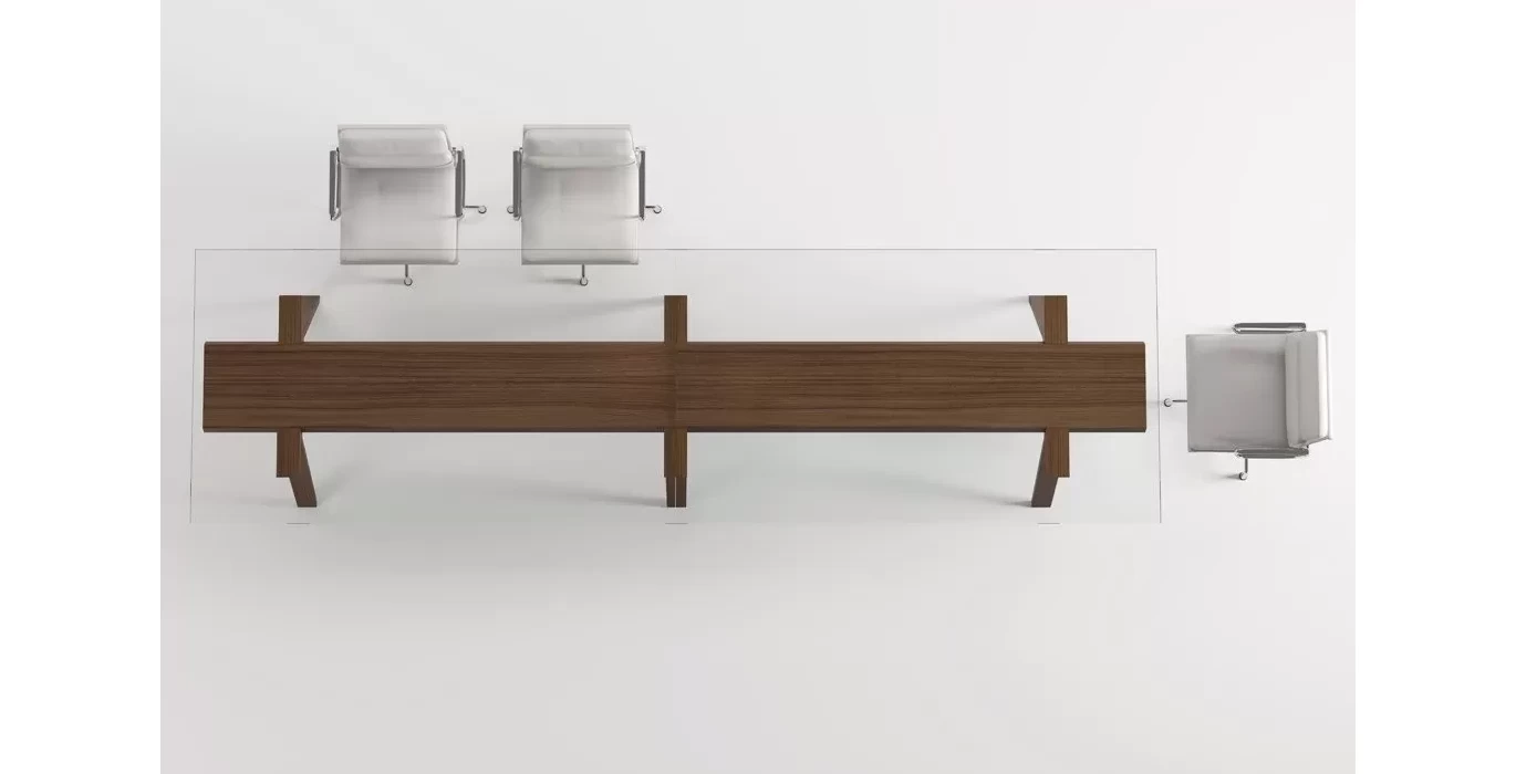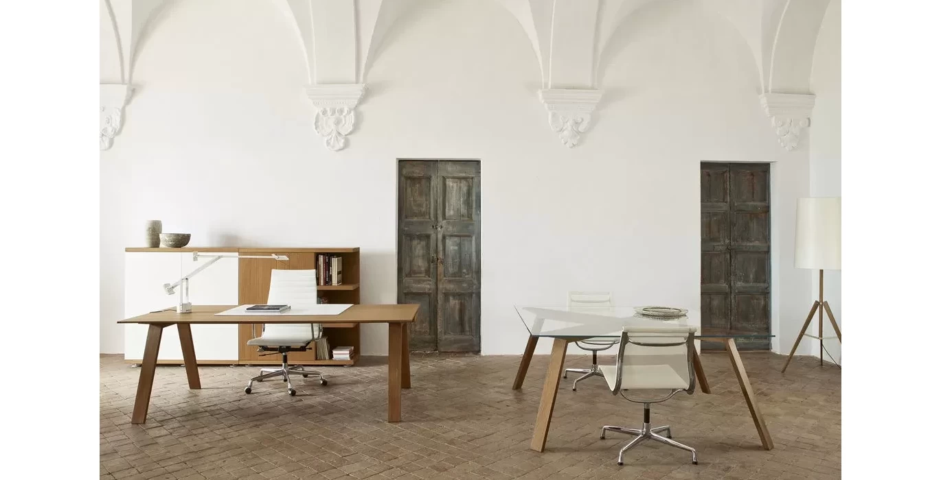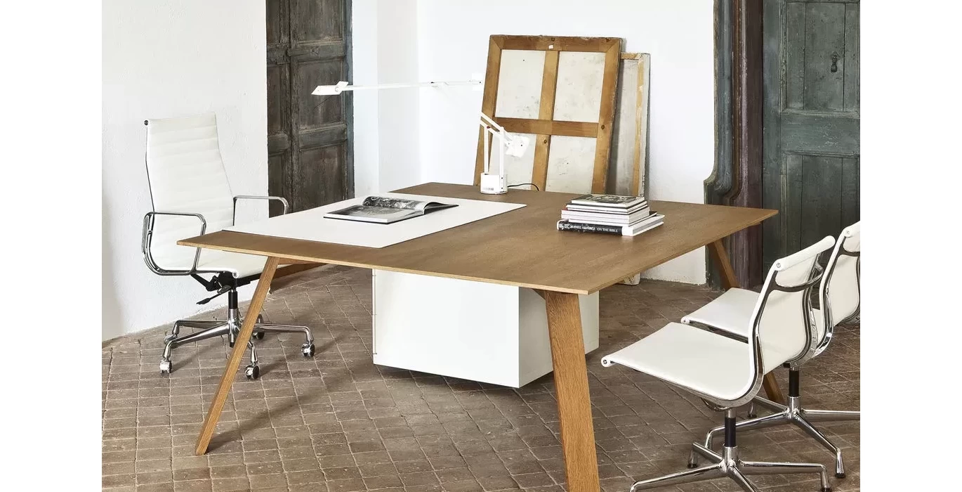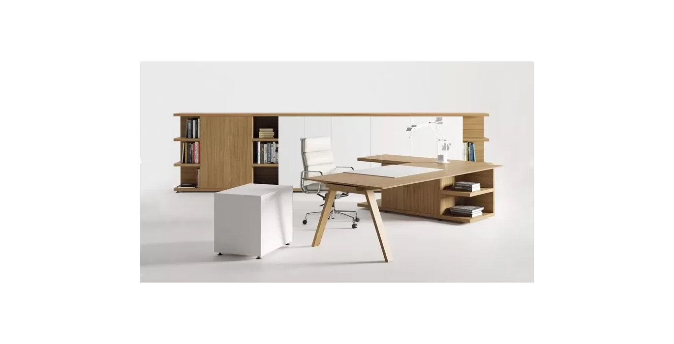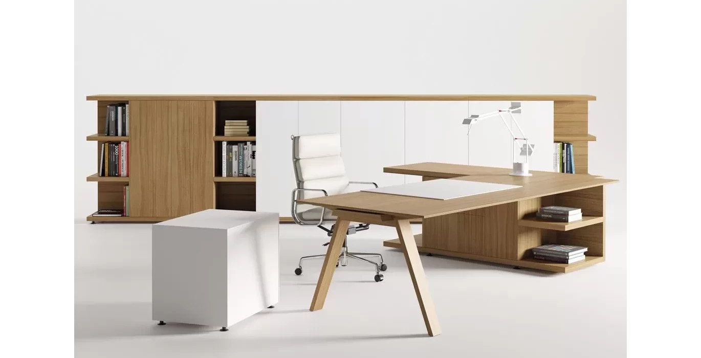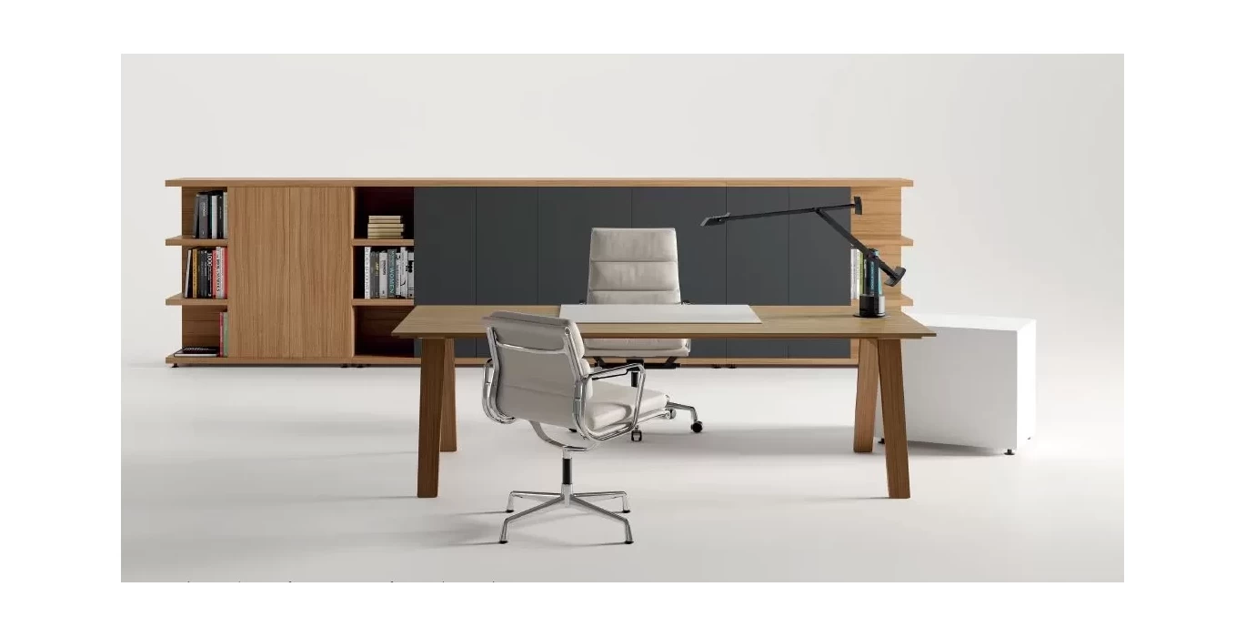 Этот кабинет руководителя для людей которые предпочитают легкие формы, плавные линии и минимализм. Кабинет сочетает в себе различные материалы и тем самым привлекает к себе еще больше внимания. Натуральное дерево и металл, который придает более тонкие грани позволит долгое время оставаться вашему кабинету в тренде и не подведет по качеству.