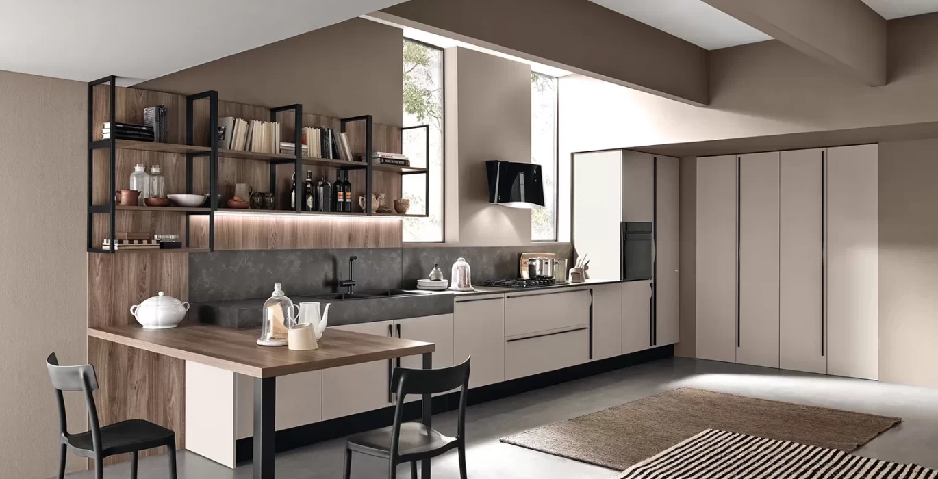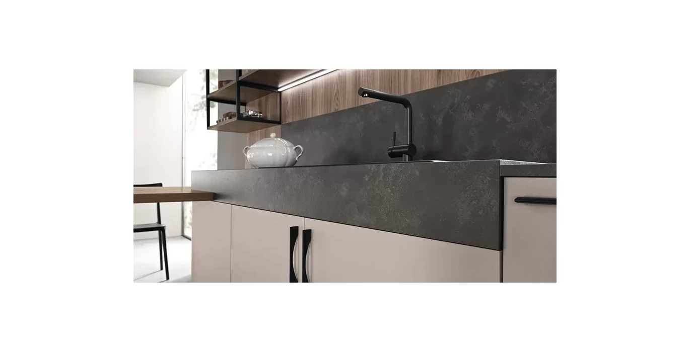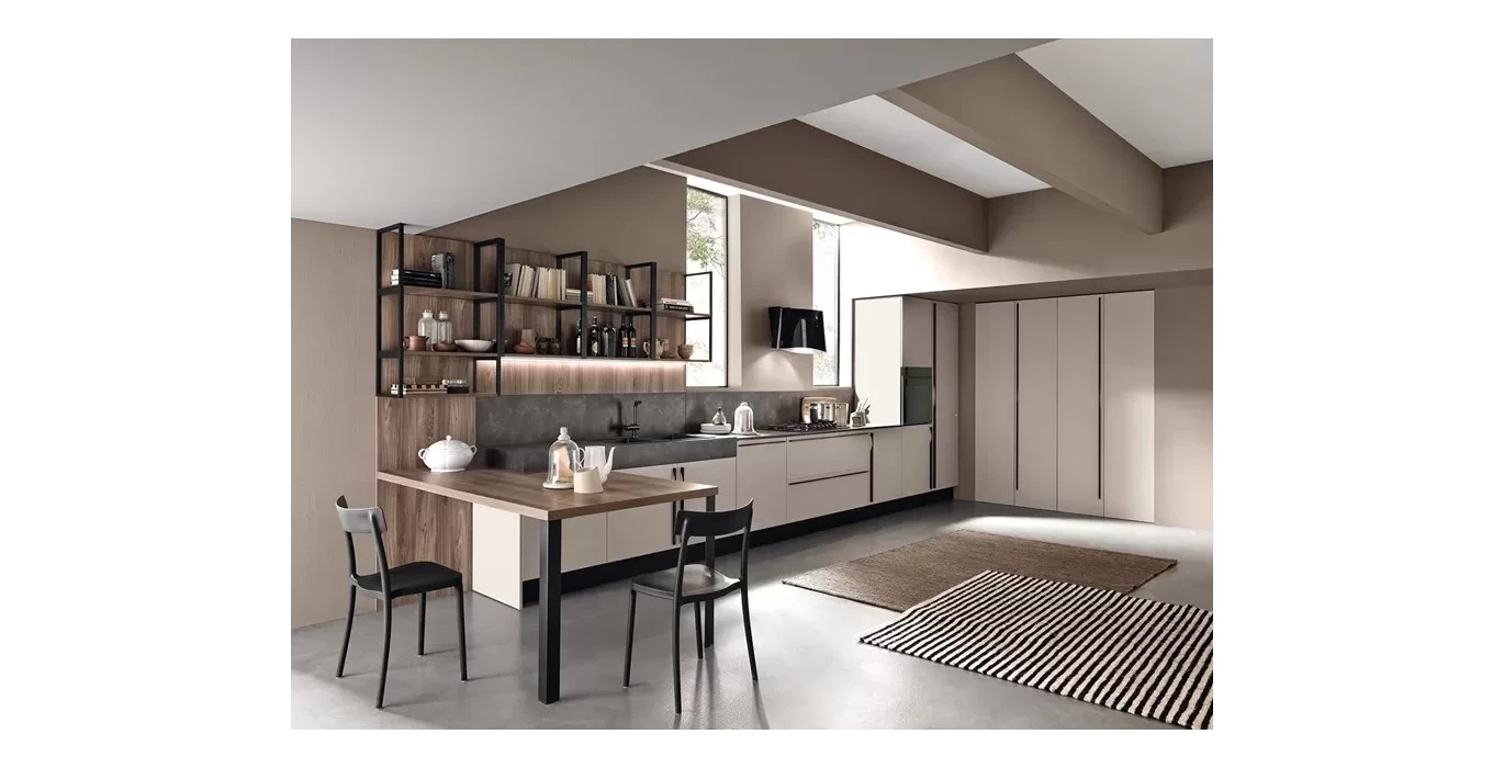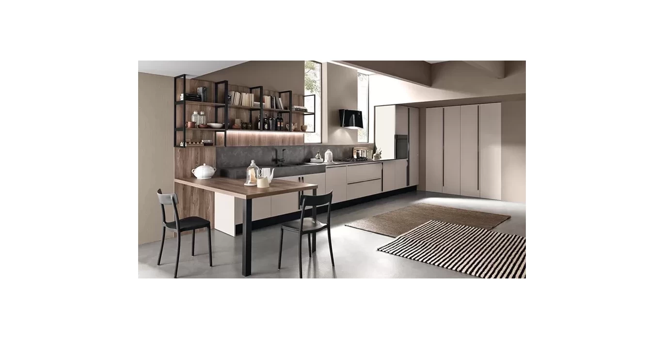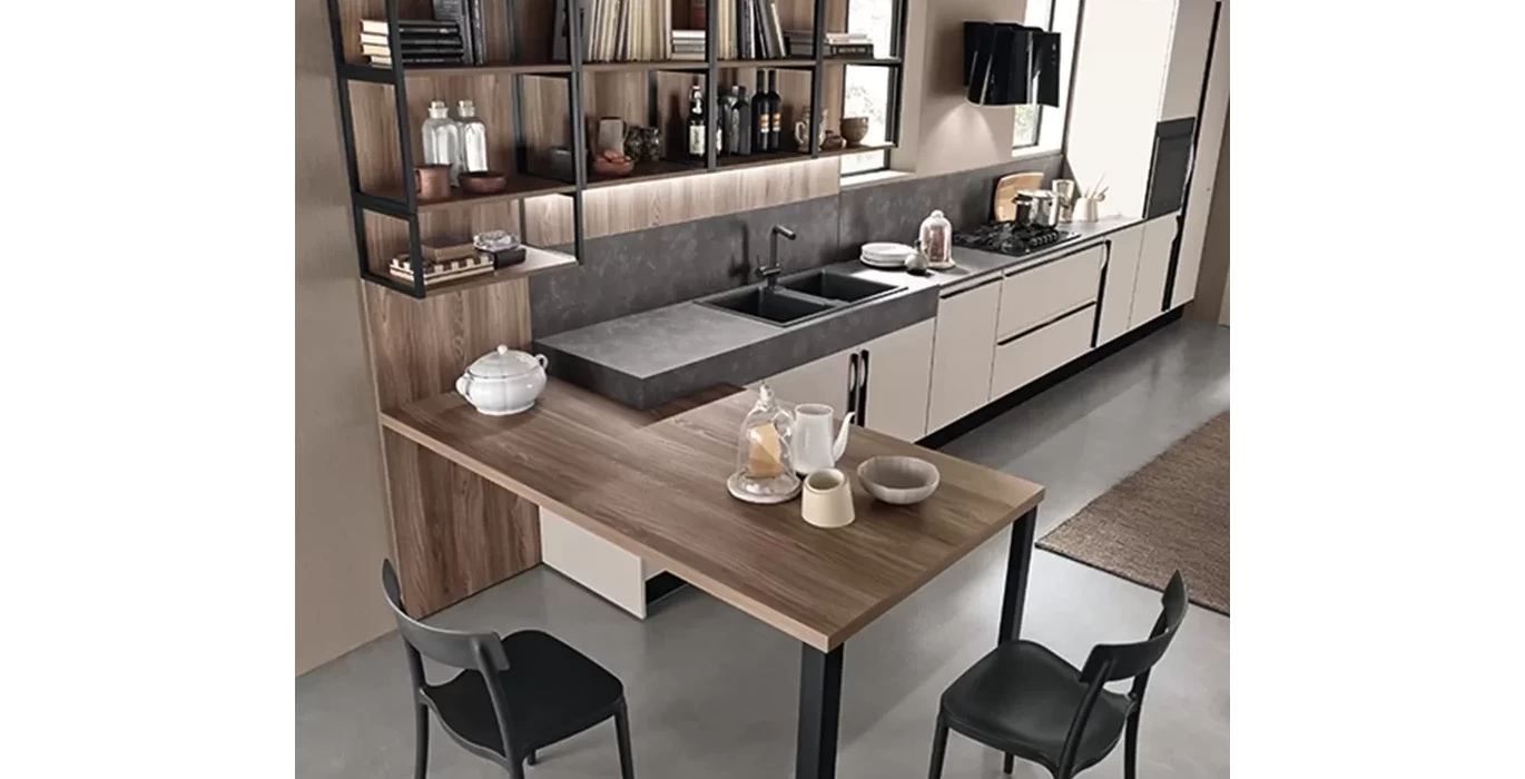 Применение не дорогих, но практичных материалов сделает эти кухню особенной именно для вашего помещения. Открытые полки с применением металла позволят сделать их нестандартной длинны и позволят избежать провисанию материала в дальнейшем, так же придадут необычный внешний вид. Выбирая один цвет материала на открытых полках и столешнице стола будут гармонично смотреться. В этой модели кухни продолжение столешницы и есть обеденный стол. В нем также применяется металл, что придаст кухонному столу прочность и долговечность.